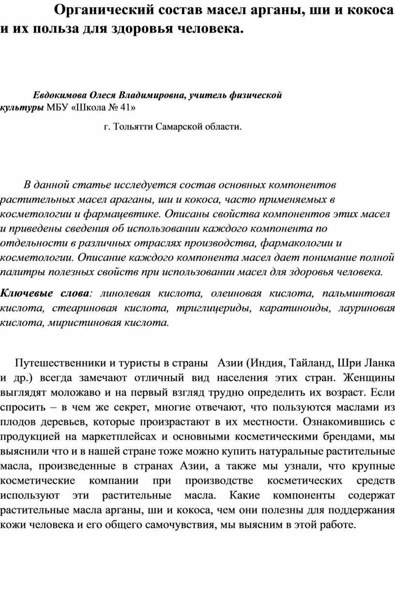 Путешественники и туристы в страны Азии (Индия, Тайланд, Шри Ланка и др.) всегда замечают отличный вид населения этих стран. Женщины выглядят моложаво и на первый взгляд трудно определить их возраст. Если спросить – в чем же секрет, многие отвечают, что пользуются маслами из плодов деревьев, которые произрастают в их местности. Ознакомившись с продукцией на маркетплейсах и основными косметическими брендами, мы выяснили что и в нашей стране тоже можно купить натуральные растительные масла, произведенные в странах Азии, а также мы узнали, что крупные косметические компании при производстве косметических средств используют эти растительные масла. Какие компоненты содержат растительные масла арганы, ши и кокоса, чем они полезны для поддержания кожи человека и его общего самочувствия, мы выясним в этой работе.