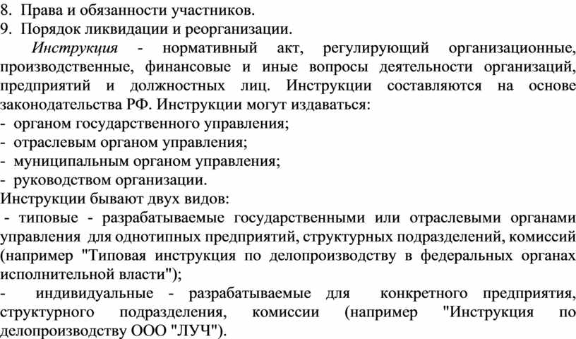 Инструкция - нормативный акт, регулирующий организационные, производственные, финансовые и иные вопросы деятельности организаций, предприятий и должностных лиц. Инструкции составляются на основе законодательства РФ. Инструкции могут издаваться: