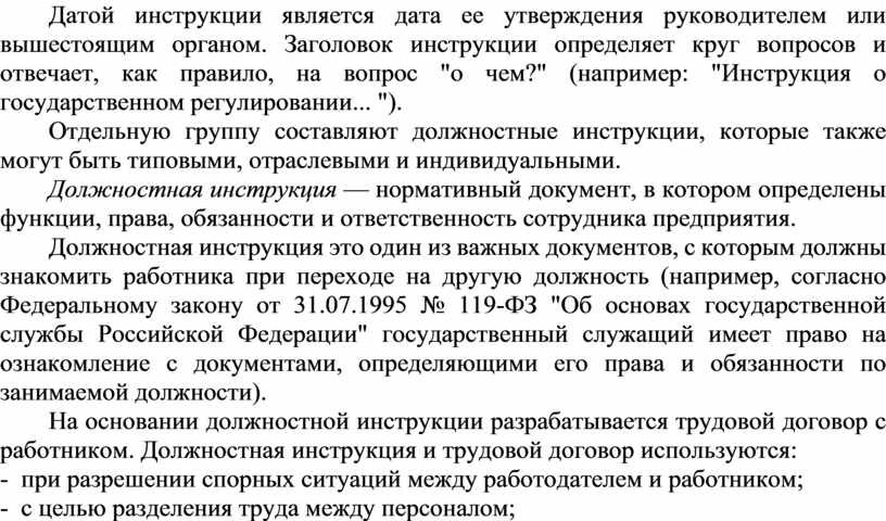 Датой инструкции является дата ее утверждения руководителем или вышестоящим органом. Заголовок инструкции определяет круг вопросов и отвечает, как правило, на вопрос "о чем?" (например: "Инструкция о государственном регулировании... ").
