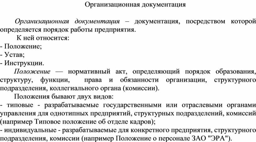 Организационная документация – документация, посредством которой определяется порядок работы предприятия.