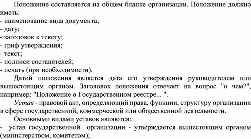 Положение — нормативный акт, определяющий порядок образования, структуру, функции, права и обязанности организации, структурного подразделения, коллегиального органа (комиссии).
