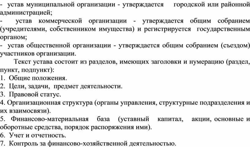 - устав коммерческой организации - утверждается общим собранием (учредителями, собственником имущества) и регистрируется государственным органом;