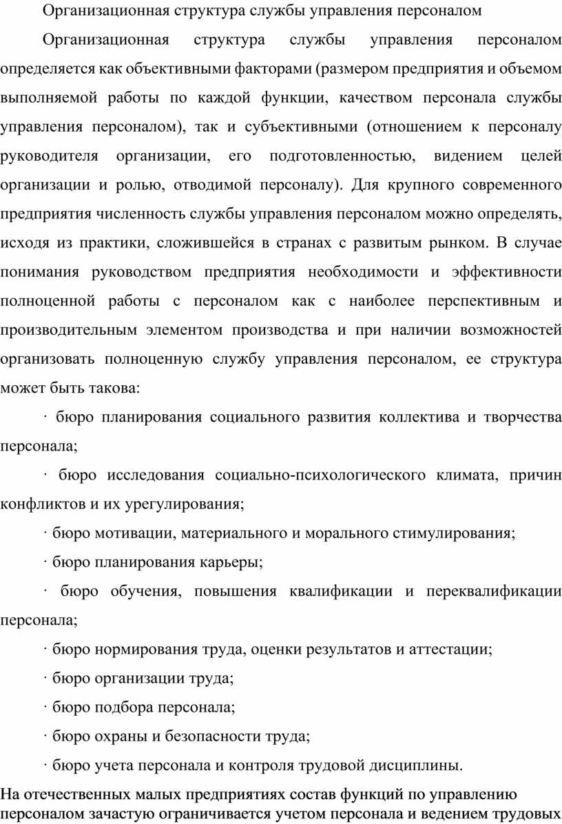 Организационная структура службы управления персоналом определяется как объективными факторами (размером предприятия и объемом выполняемой работы по каждой функции, качеством персонала службы управления персоналом), так и субъективными (отношением к персоналу руководителя организации, его подготовленностью, видением целей организации и ролью, отводимой персоналу). Для крупного современного предприятия численность службы управления персоналом можно определять, исходя из практики, сложившейся в странах с развитым рынком. В случае понимания руководством предприятия необходимости и эффективности полноценной работы с персоналом как с наиболее перспективным и производительным элементом производства и при наличии возможностей организовать полноценную службу управления персоналом, ее структура может быть такова: