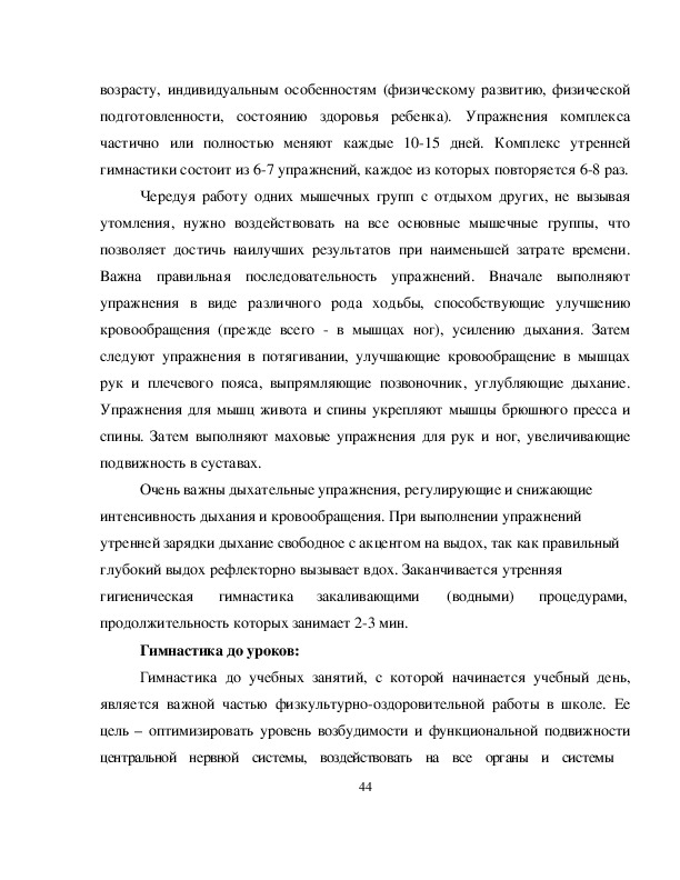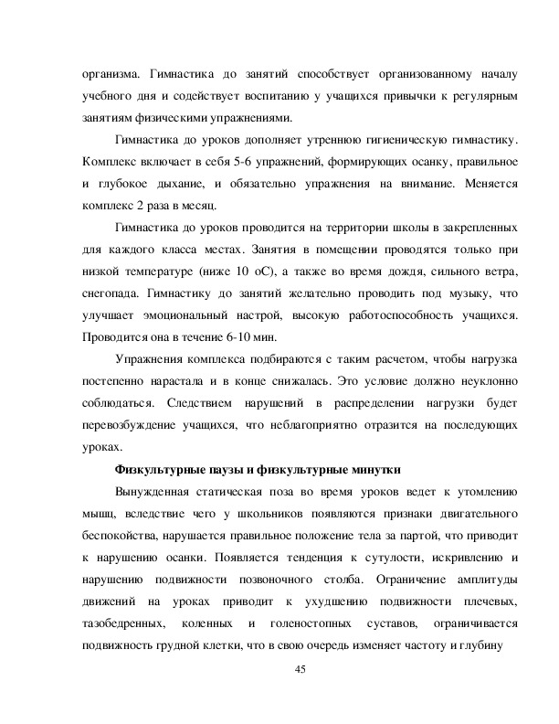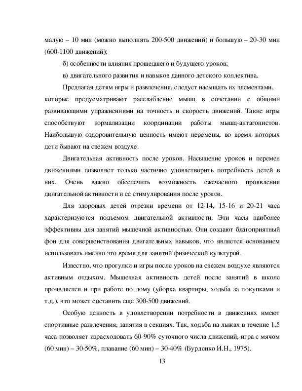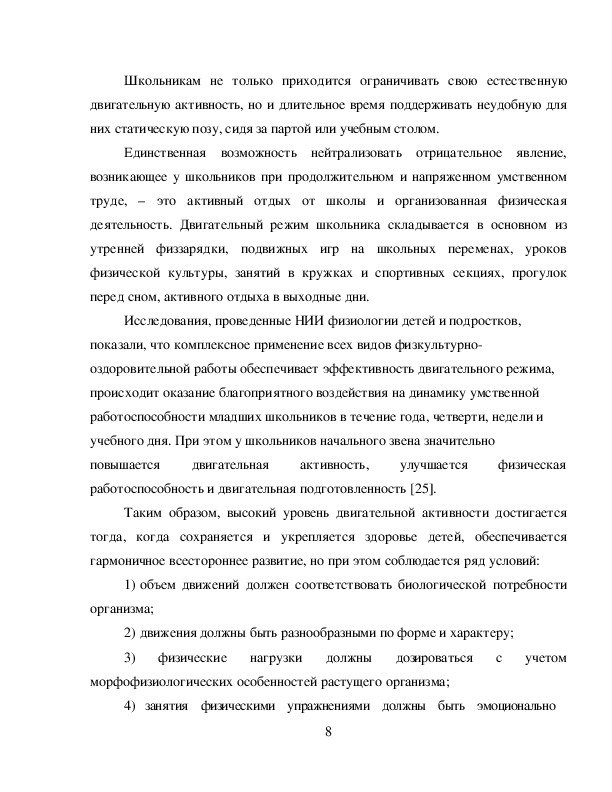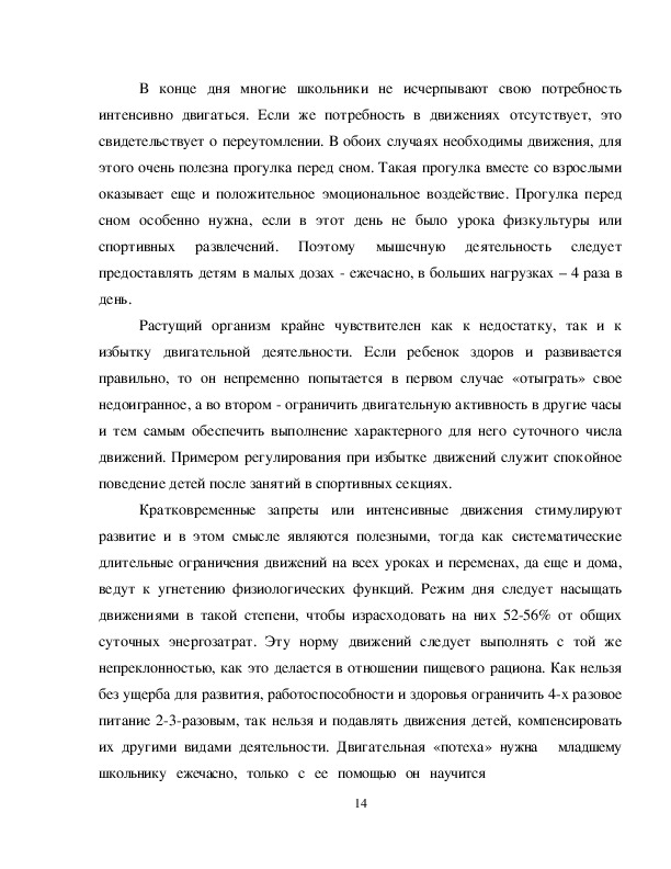 Единственная возможность нейтрализовать отрицательное явление, возникающее у школьников при продолжительном и напряженном умственном труде, - это активный отдых от школы и организованная физическая деятельность. Двигательный режим школьника складывается в основном из утренней физзарядки, подвижных игр на школьных переменах, уроков физической культуры, занятий в кружках и спортивных секциях, прогулок перед сном, активного отдыха в выходные дни.