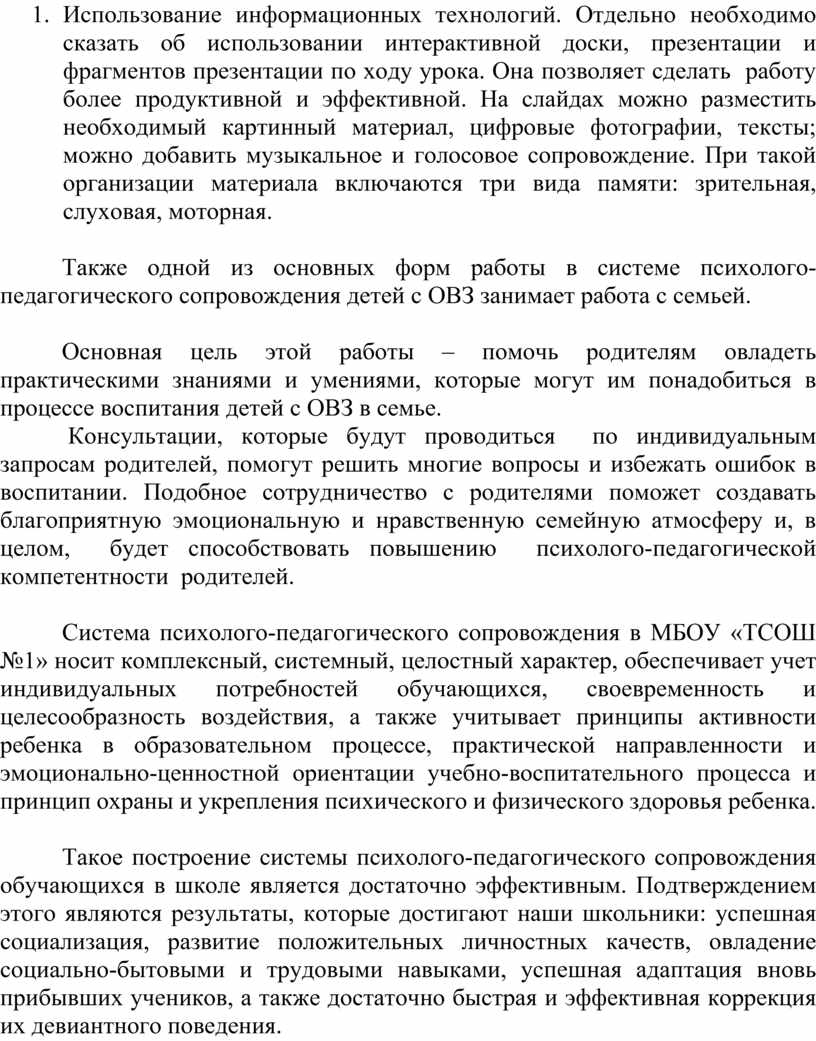 Система психолого-педагогического сопровождения в МБОУ «ТСОШ №1» носит комплексный, системный, целостный характер, обеспечивает учет индивидуальных потребностей обучающихся, своевременность и целесообразность воздействия, а также учитывает принципы активности ребенка в образовательном процессе, практической направленности и эмоционально-ценностной ориентации учебно-воспитательного процесса и принцип охраны и укрепления психического и физического здоровья ребенка.