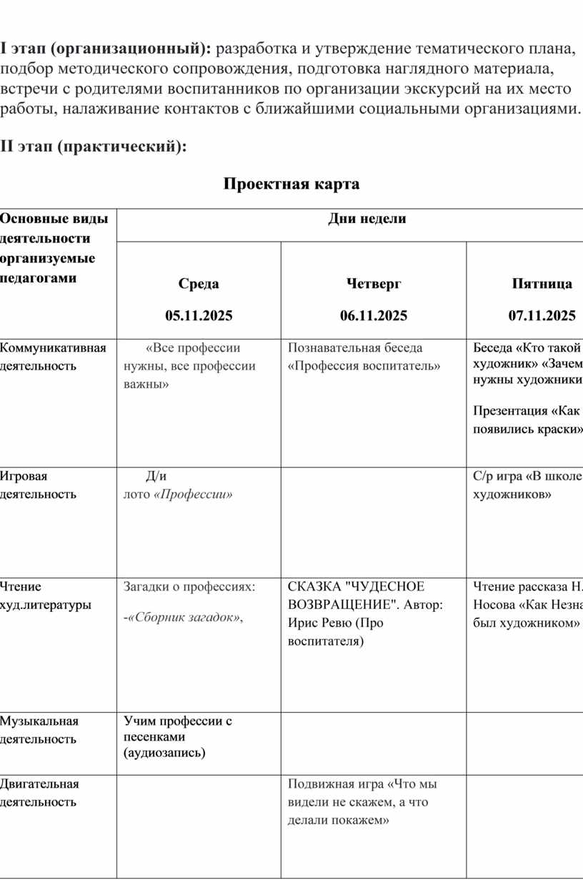 I этап (организационный): разработка и утверждение тематического плана, подбор методического сопровождения, подготовка наглядного материала, встречи с родителями воспитанников по организации экскурсий на их место работы, налаживание контактов с ближайшими социальными организациями.