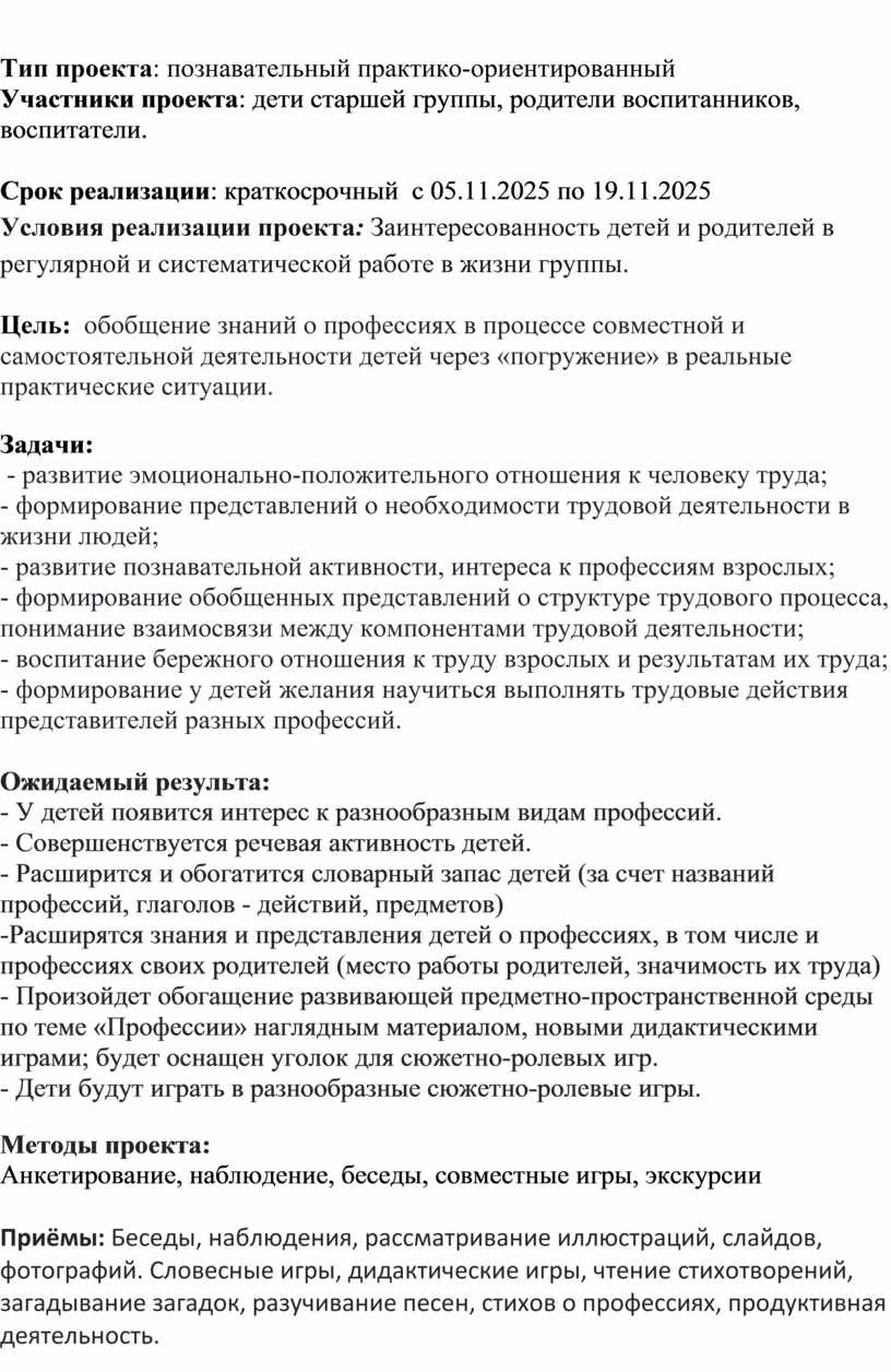 Приёмы: Беседы, наблюдения, рассматривание иллюстраций, слайдов, фотографий. Словесные игры, дидактические игры, чтение стихотворений, загадывание загадок, разучивание песен, стихов о профессиях, продуктивная деятельность.