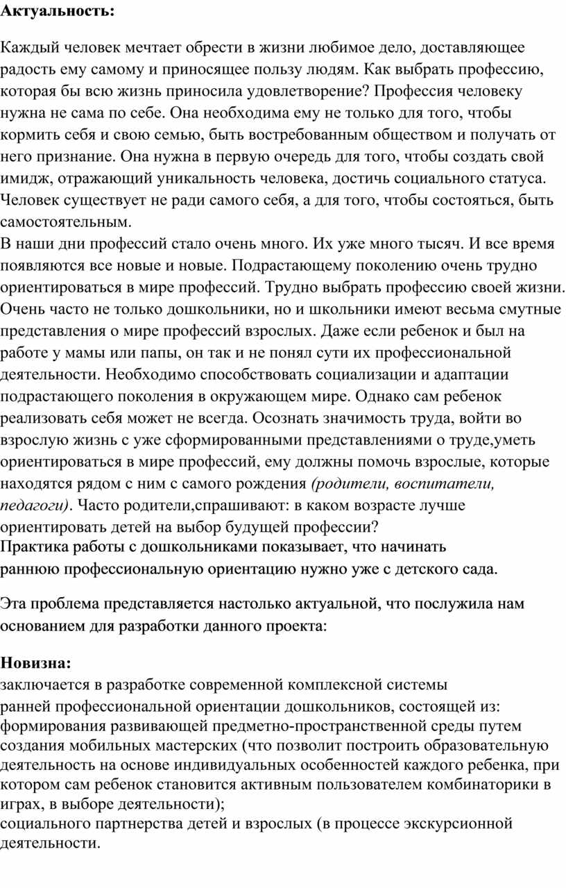В наши дни профессий стало очень много. Их уже много тысяч. И все время появляются все новые и новые. Подрастающему поколению очень трудно ориентироваться в мире профессий. Трудно выбрать профессию своей жизни. Очень часто не только дошкольники, но и школьники имеют весьма смутные представления о мире профессий взрослых. Даже если ребенок и был на работе у мамы или папы, он так и не понял сути их профессиональной деятельности. Необходимо способствовать социализации и адаптации подрастающего поколения в окружающем мире. Однако сам ребенок реализовать себя может не всегда. Осознать значимость труда, войти во взрослую жизнь с уже сформированными представлениями о труде,уметь ориентироваться в мире профессий, ему должны помочь взрослые, которые находятся рядом с ним с самого рождения (родители, воспитатели, педагоги). Часто родители,спрашивают: в каком возрасте лучше ориентировать детей на выбор будущей профессии?
