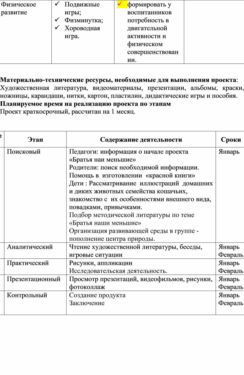 Педагоги: информация о начале проекта «Братья наи меньшие» Родители: поиск необходимой информации. Помощь в изготовлении «красной книги» Дети : Рассматривание иллюстраций домашних и диких животных семейства кошачьих, знакомство с их особенностями внешнего вида, повадками, привычками. Подбор методической литературы по теме «Братья наши меньшие» Организация развивающей среды в группе - пополнение центра природы. |