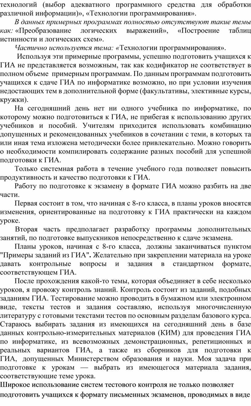 Используя эти примерные программы, успешно подготовить учащихся к ГИА не представляется возможным, так как кодификатор не соответствует в полном объеме примерным программам. По данным программам подготовить учащихся к сдаче ГИА по информатике возможно, но при условии изучения недостающих тем в дополнительной форме (факультативы, элективные курсы, кружки).