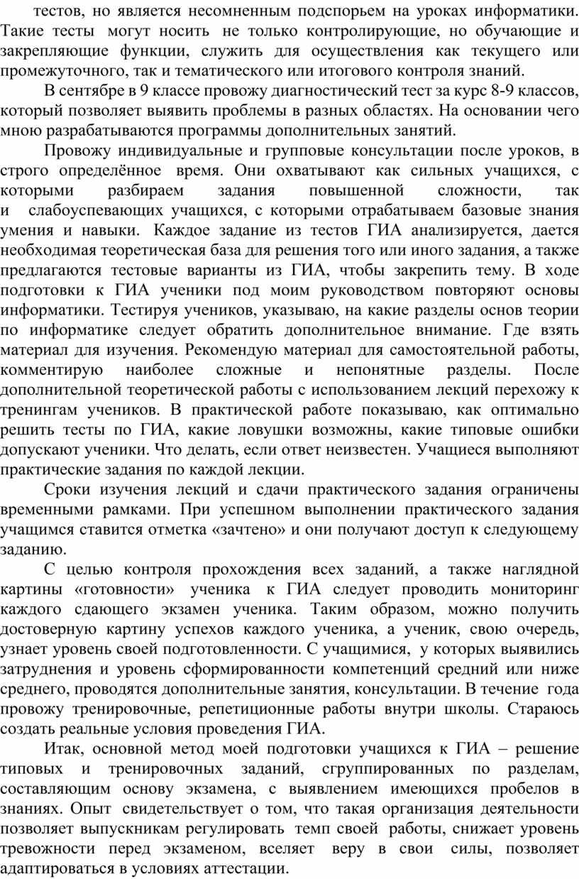 Провожу индивидуальные и групповые консультации после уроков, в строго определённое время. Они охватывают как сильных учащихся, с которыми разбираем задания повышенной сложности, так и слабоуспевающих учащихся, с которыми отрабатываем базовые знания умения и навыки. Каждое задание из тестов ГИА анализируется, дается необходимая теоретическая база для решения того или иного задания, а также предлагаются тестовые варианты из ГИА, чтобы закрепить тему. В ходе подготовки к ГИА ученики под моим руководством повторяют основы информатики. Тестируя учеников, указываю, на какие разделы основ теории по информатике следует обратить дополнительное внимание. Где взять материал для изучения. Рекомендую материал для самостоятельной работы, комментирую наиболее сложные и непонятные разделы. После дополнительной теоретической работы с использованием лекций перехожу к тренингам учеников. В практической работе показываю, как оптимально решить тесты по ГИА, какие ловушки возможны, какие типовые ошибки допускают ученики. Что делать, если ответ неизвестен. Учащиеся выполняют практические задания по каждой лекции.