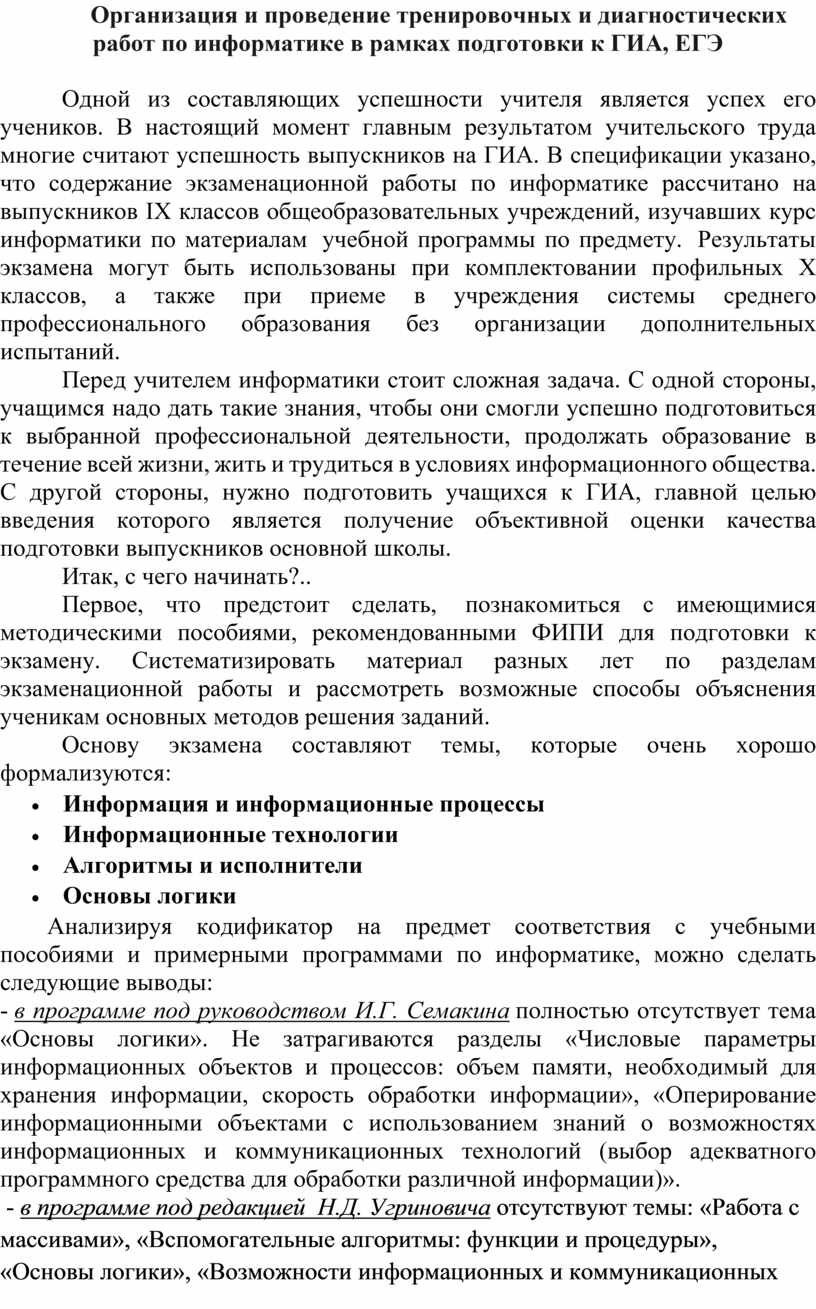Организация и проведение тренировочных и диагностических работ по информатике в рамках подготовки к ГИА, ЕГЭ