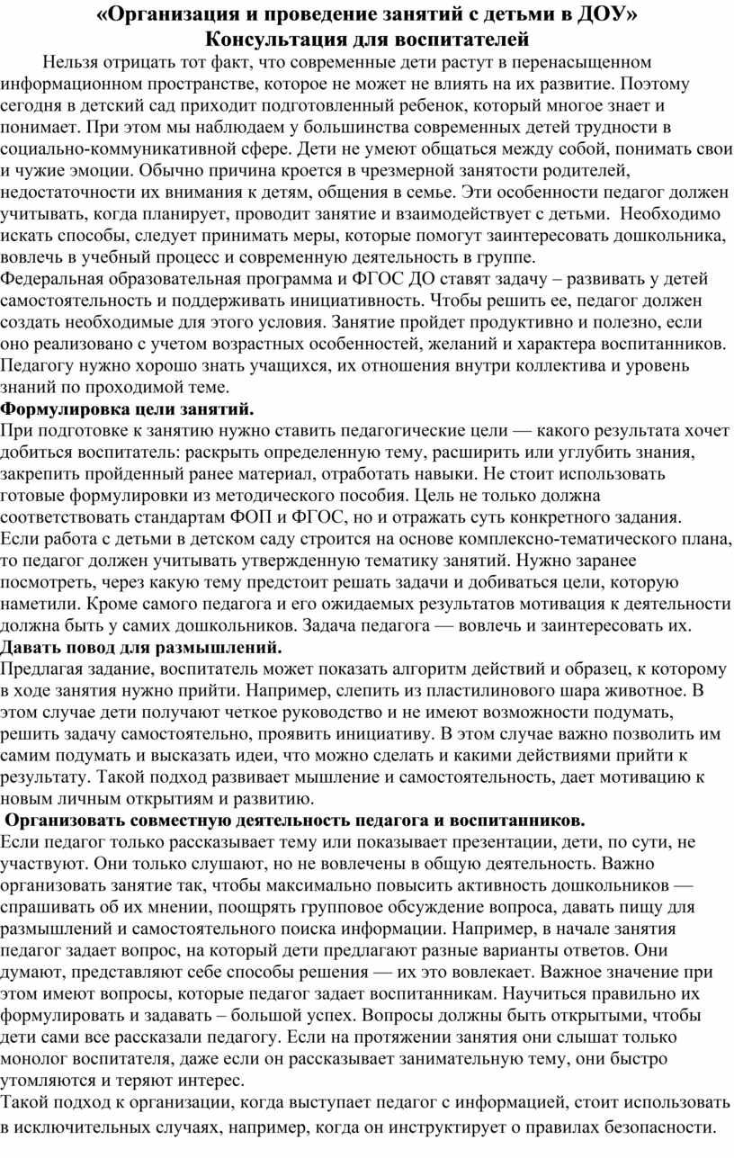 «Организация и проведение занятий с детьми в ДОУ» Консультация для воспитателей