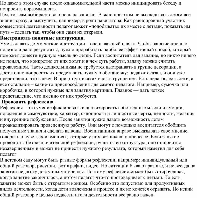 Рефлексия – это умение фиксировать и анализировать собственные мысли и эмоции, поведение и самочувствие, характер, склонности и личностные черты, ценности, желания и внутренние побуждения. После занятия нужно давать возможность детям проанализировать проведенную работу. Они могут с помощью воспитателя обобщить полученные знания и сделать выводы. Воспитанники вправе высказывать свое мнение, говорить о чувствах и эмоциях, которые у них возникали в процессе. Если занятие проводится без заключительной рефлексии, рушится его структура, оно становится незавершенным и может не принести нужного результата, который наметил для себя педагог.