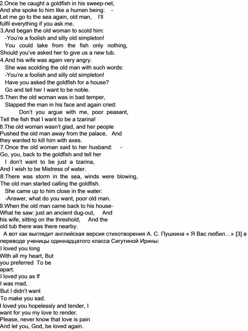 А вот как выглядит английская версия стихотворения А. С. Пушкина « Я Вас любил…» [3] в переводе ученицы одиннадцатого класса Сигутиной Ирины: