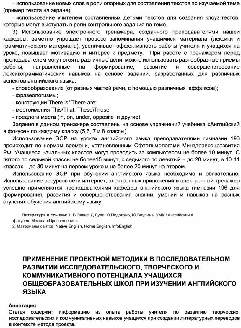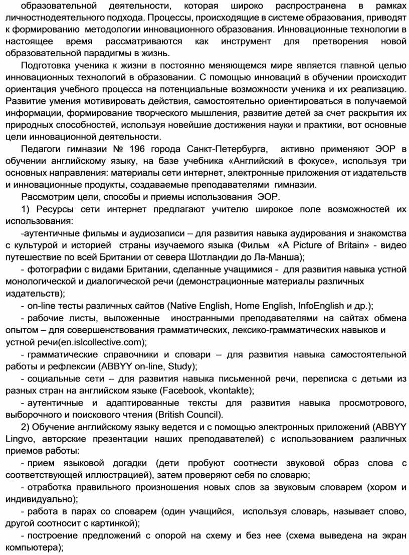 Использование ЭОР при обучении английского языка необходимо и обязательно. Использование ресурсов сети интернет, электронных приложений и электронный тренажер успешно применяются преподавателями кафедры английского языка гимназии 196 для формирования, развития и совершенствования знаний, умений и навыков на разных ступенях обучения английскому языку.