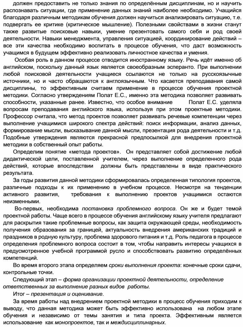 Особая роль в данном процессе отводится иностранному языку. Речь идёт именно об английском, поскольку данный язык является своеобразным эсперанто. При выполнении любой поисковой деятельности учащиеся ссылаются не только на русскоязычные источники, но и часто обращаются к англоязычным. Что касается преподавания самой дисциплины, то эффективным считаем применение в процессе обучения проектной методики. Согласно утверждениям Полат Е.С., именно эта методика позволяет развивать способности, указанные ранее. Известно, что особое внимание Полат Е.С. уделяла вопросам преподавания английского языка, используя при этом проектные методики. Профессор считала, что метод проектов позволяет развивать речевые компетенции через выполнение учащимися широкого спектра действий: поиск информации, анализ данных, формирование мысли, высказывание данной мысли, презентация рода деятельности и т.д. Подобные утверждения являются прекрасной предпосылкой для внедрения проектной методики в собственный опыт работы.