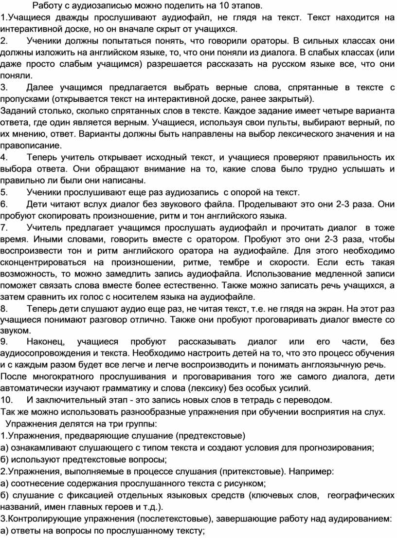 Итак, как вы видите, в этой работе я попыталась описать основы для развития прослушивания, которые могут быть применены к любому прослушиванию текста. Разумеется это не единственный способ. Учитель может искать новые подходы в развитии понимания речи на слух.