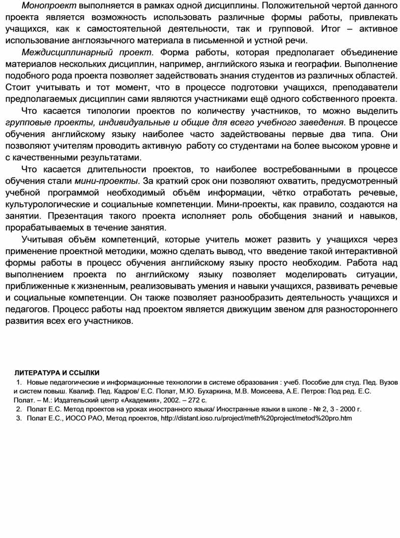 2. Полат Е.С. Метод проектов на уроках иностранного языка/ Иностранные языки в школе - № 2, 3 - 2000 г.