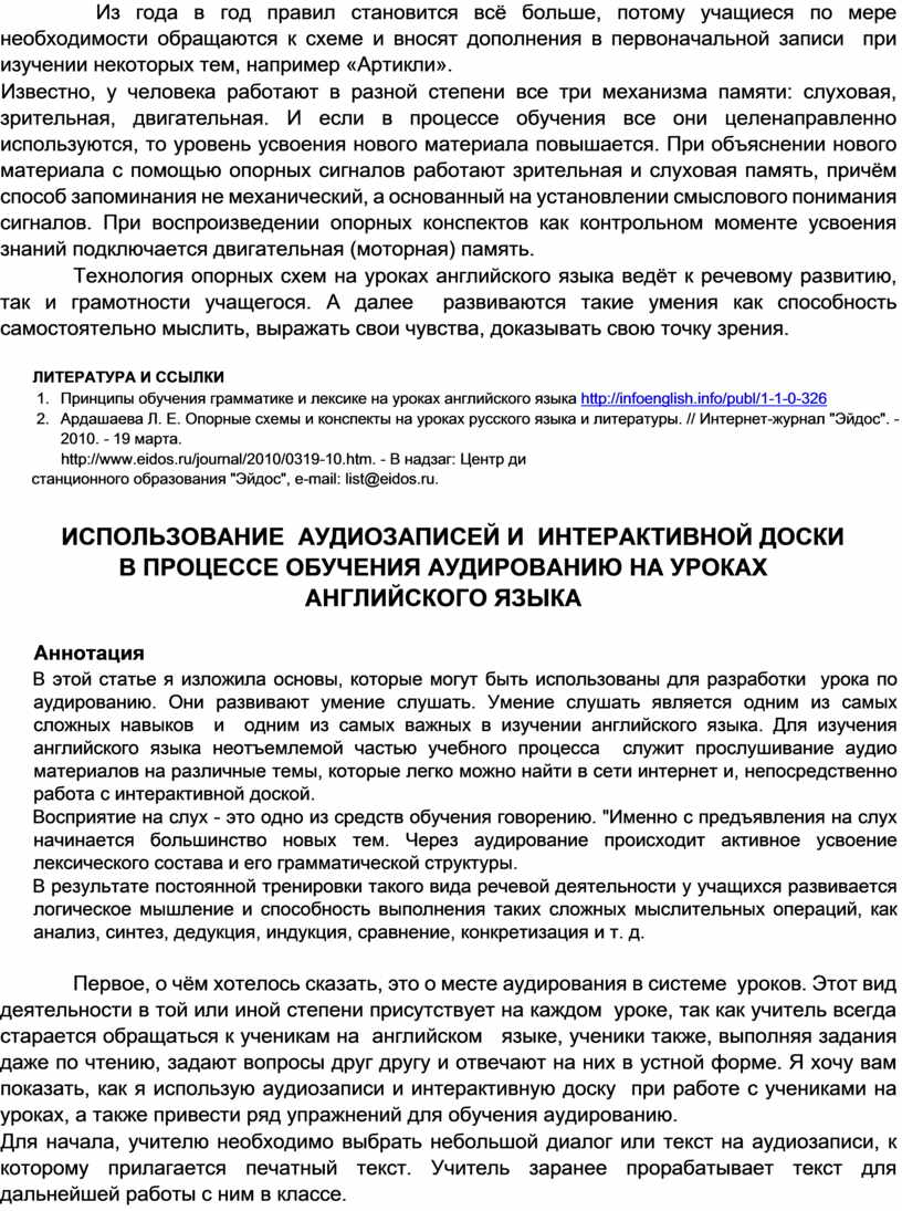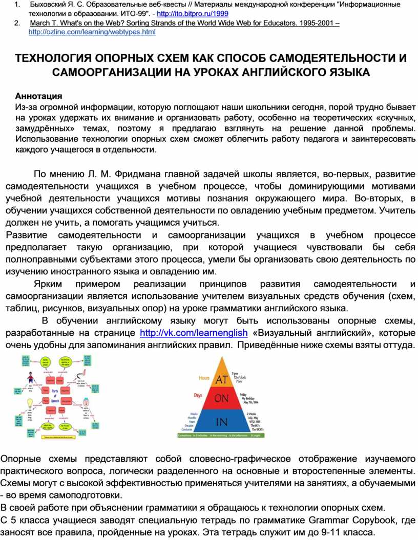 2. Ардашаева Л. Е. Опорные схемы и конспекты на уроках русского языка и литературы. // Интернет-журнал "Эйдос". - 2010. - 19 марта.
