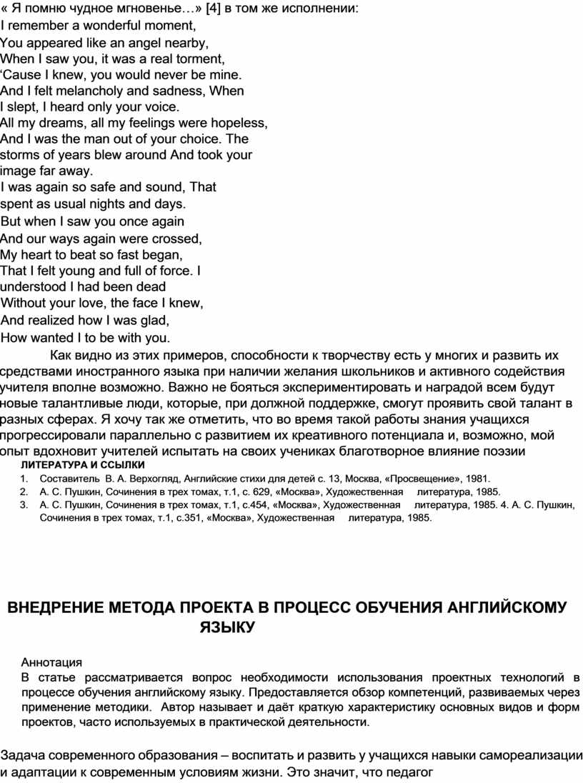 Многое было уже написано о благотворном влиянии метода проекта на развитие способностей школьников к творчеству, исследовательской деятельности и на рост их навыков коммуникации при изучении иностранных языков. В своей работе я применяю как сам этот метод, так и его элементы. В течение нескольких лет мои учащиеся занимаются творческими переводами англоязычной поэзии на русский язык и наоборот, применяя метод проекта.