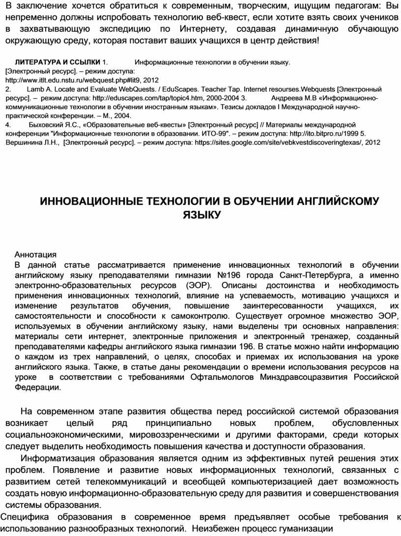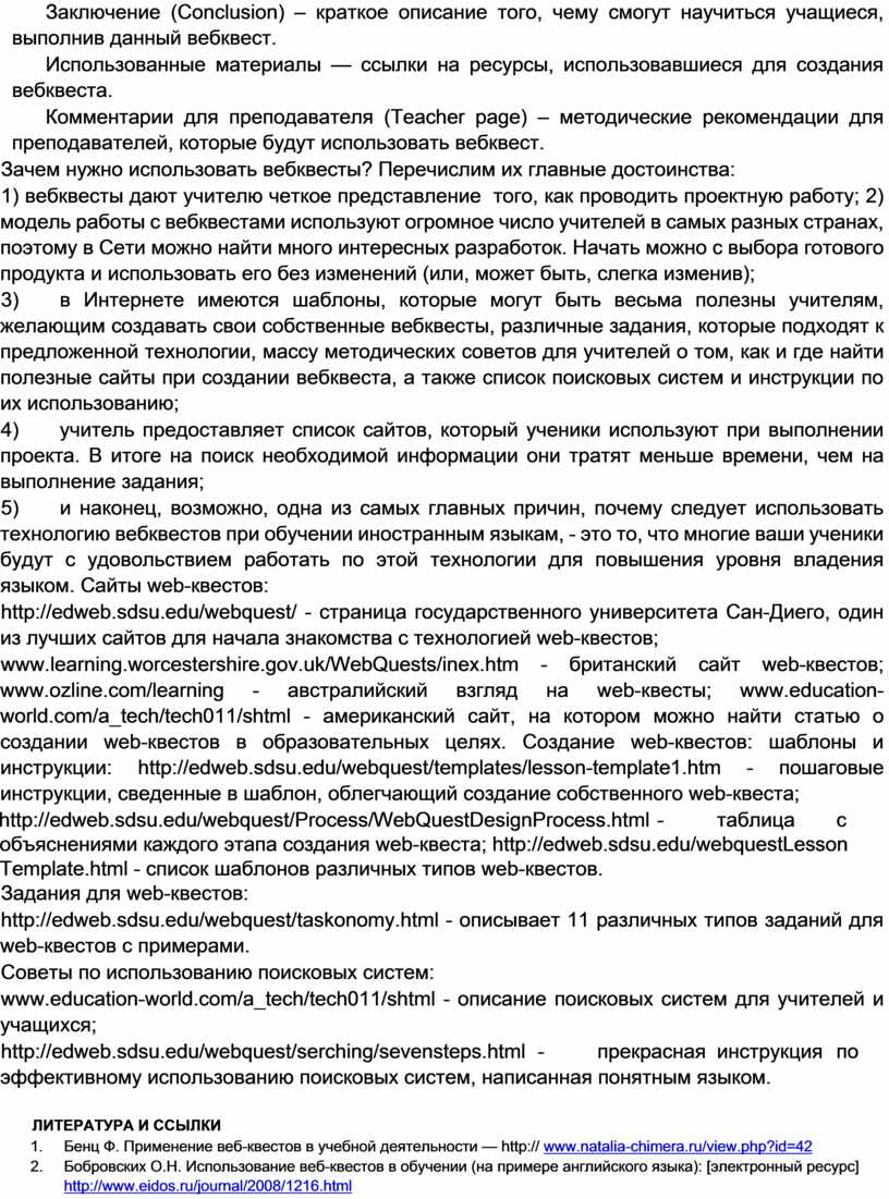 2. Бобровских О.Н. Использование веб-квестов в обучении (на примере английского языка): [электронный ресурс] http://www.eidos.ru/journal/2008/1216.html