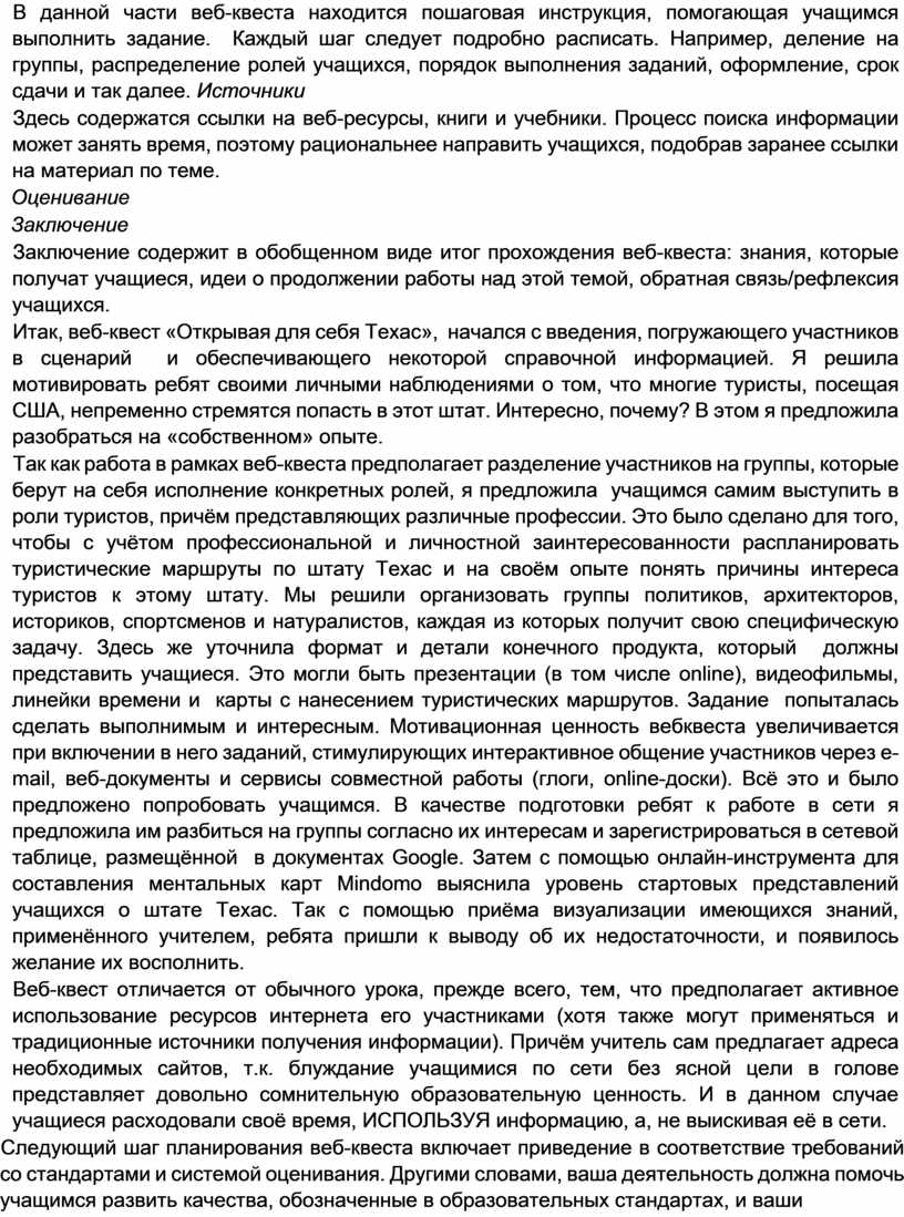 Оценка (Evaluation) – описание критериев и параметров оценки выполнения вебквеста, которое представляется в виде бланка оценки. Критерии оценки зависят от типа учебных задач, которые решаются в вебквесте.