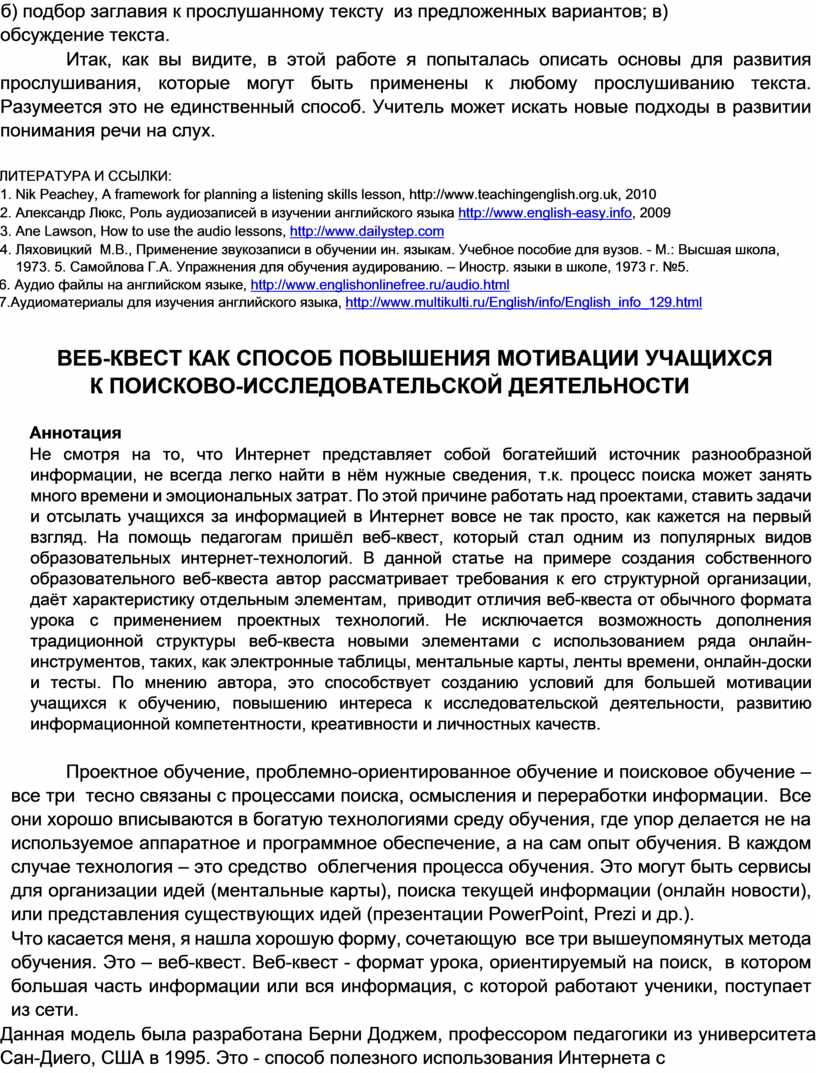 Что касается меня, я нашла хорошую форму, сочетающую все три вышеупомянутых метода обучения. Это – веб-квест. Веб-квест - формат урока, ориентируемый на поиск, в котором большая часть информации или вся информация, с которой работают ученики, поступает из сети.