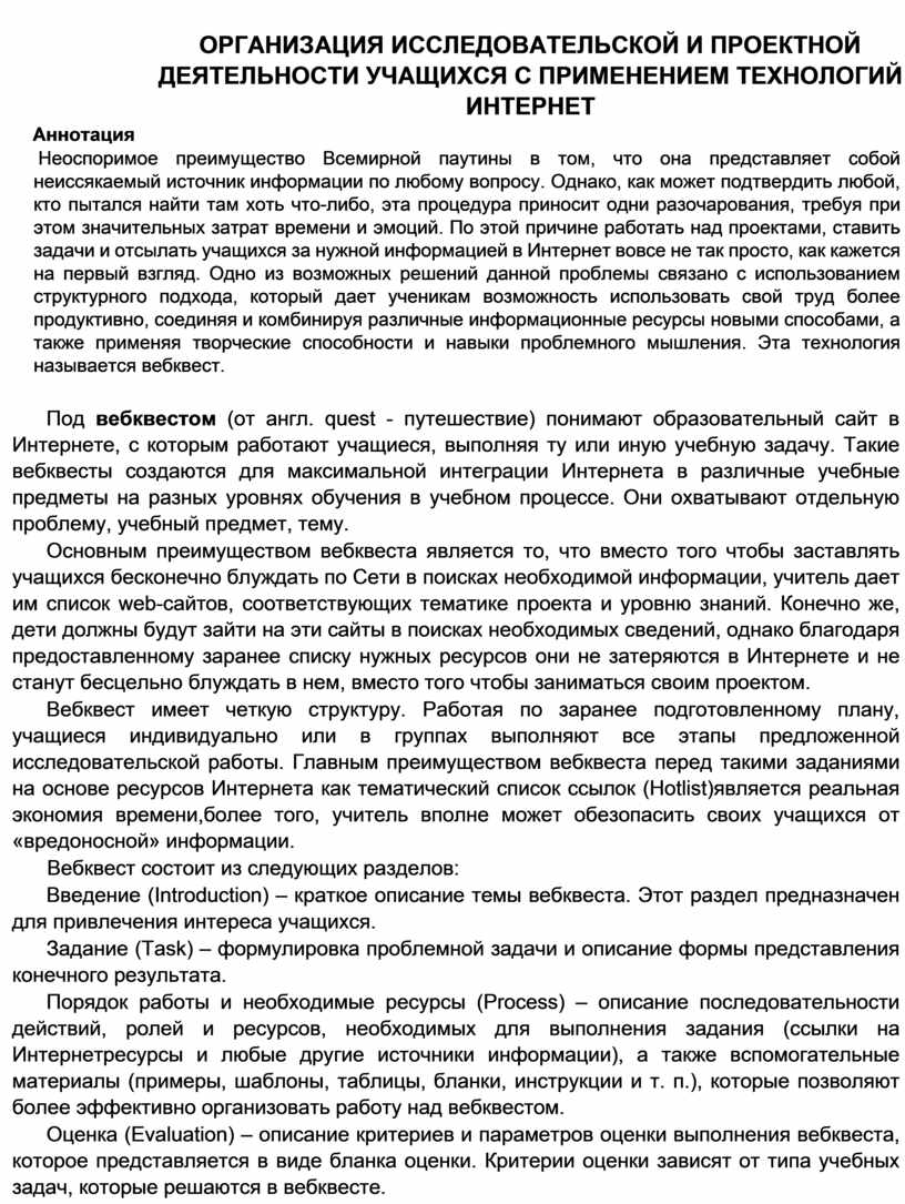 Неоспоримое преимущество Всемирной паутины в том, что она представляет собой неиссякаемый источник информации по любому вопросу. Однако, как может подтвердить любой, кто пытался найти там хоть что-либо, эта процедура приносит одни разочарования, требуя при этом значительных затрат времени и эмоций. По этой причине работать над проектами, ставить задачи и отсылать учащихся за нужной информацией в Интернет вовсе не так просто, как кажется на первый взгляд. Одно из возможных решений данной проблемы связано с использованием структурного подхода, который дает ученикам возможность использовать свой труд более продуктивно, соединяя и комбинируя различные информационные ресурсы новыми способами, а также применяя творческие способности и навыки проблемного мышления. Эта технология называется вебквест.