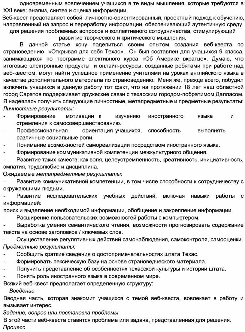 В данной статье хочу поделиться своим опытом создания веб-квеста по страноведению «Открывая для себя Техас». Он был составлен для учащихся 9 класса, занимающихся по программе элективного курса «Об Америке вкратце». Думаю, что итоговые электронные продукты и онлайн-ресурсы, созданные ребятами при работе над веб-квестом, могут найти успешное применение учителями на уроках английского языка в качестве дополнительного материала по страноведению. Меня же, прежде всего, побудил включить учащихся в данную работу тот факт, что на протяжении 18 лет наш областной город Саратов поддерживает дружеские связи с техасским городом-побратимом Далласом. Я надеялась получить следующие личностные, метапредметные и предметные результаты: