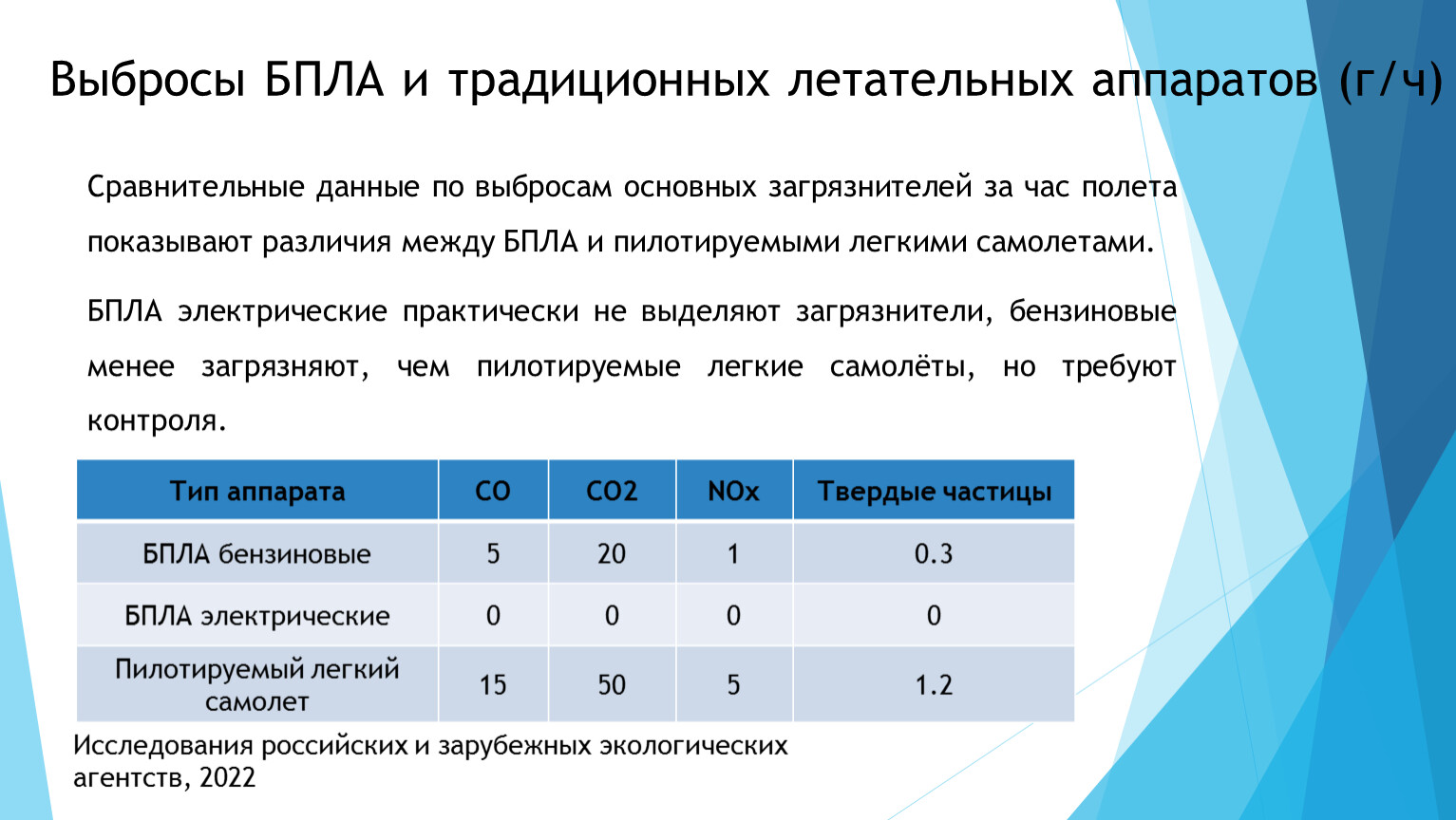 Сравнительные данные по выбросам основных загрязнителей за час полета показывают различия между БПЛА и пилотируемыми легкими самолетами.