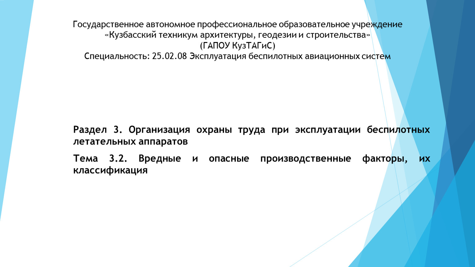 Государственное автономное профессиональное образовательное учреждение «Кузбасский техникум архитектуры, геодезии и строительства»(ГАПОУ КузТАГиС)Специальность: 25.02.08 Эксплуатация беспилотных авиационных систем