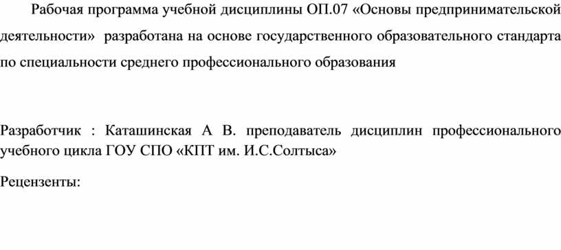 Рабочая программа учебной дисциплины ОП.07 «Основы предпринимательской деятельности» разработана на основе государственного образовательного стандарта по специальности среднего профессионального образования