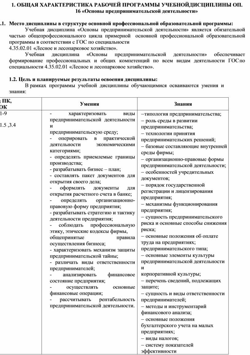 Учебная дисциплина «Основы предпринимательской деятельности» обеспечивает формирование профессиональных и общих компетенций по всем видам деятельности ГОС по специальности 4.35.02.01 «Лесное и лесопарковое хозяйство».