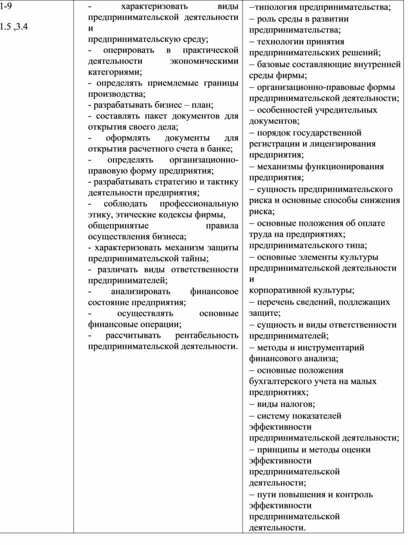 - характеризовать виды предпринимательской деятельности и предпринимательскую среду; - оперировать в практической деятельности экономическими категориями; - определять приемлемые границы производства; - разрабатывать бизнес – план; - составлять пакет документов для открытия своего дела; - оформлять документы для открытия расчетного счета в банке; - определять организационно-правовую форму предприятия; - разрабатывать стратегию и тактику деятельности предприятия; - соблюдать профессиональную этику, этические кодексы фирмы, общепринятые правила осуществления бизнеса; - характеризовать механизм защиты предпринимательской тайны; - различать виды ответственности предпринимателей; - анализировать финансовое состояние предприятия; - осуществлять основные финансовые операции; - рассчитывать рентабельность предпринимательской деятельности. |