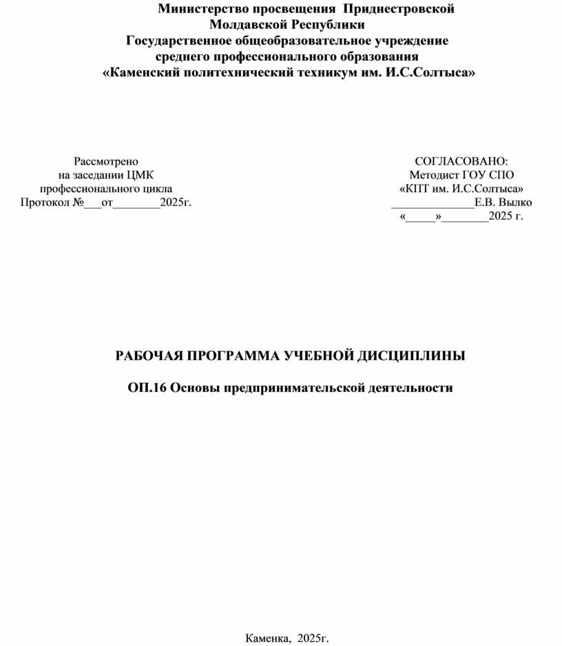 СОГЛАСОВАНО: Методист ГОУ СПО «КПТ им. И.С.Солтыса» ______________Е.В. Вылко «_____»________2025 г. |
