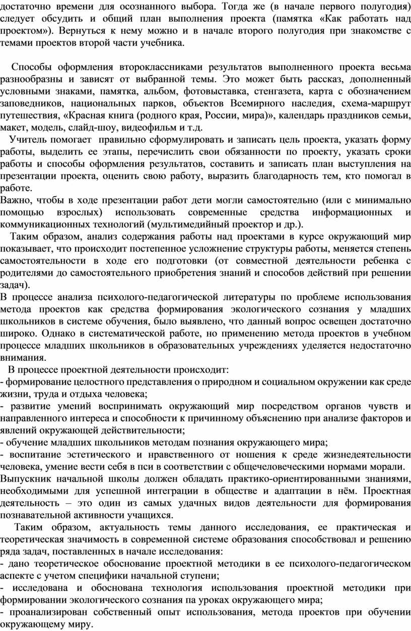 В процессе анализа психолого-педагогической литературы по проблеме использования метода проектов как средства формирования экологического сознания у младших школьников в системе обучения, было выявлено, что данный вопрос освещен достаточно широко. Однако в систематической работе, но применению метода проектов в учебном процессе младших школьников в образовательных учреждениях уделяется недостаточно внимания.