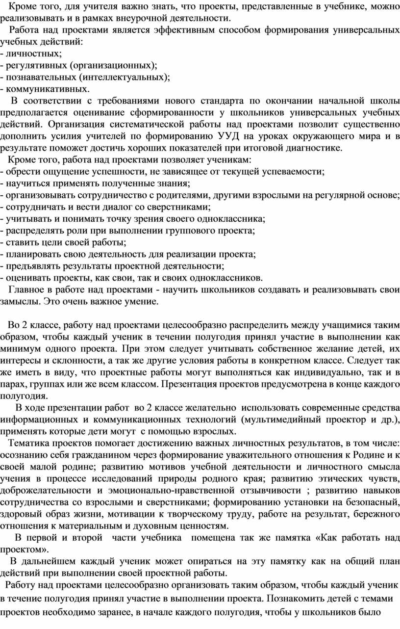 Работу над проектами целесообразно организовать таким образом, чтобы каждый ученик в течение полугодия принял участие в выполнении проекта. Познакомить детей с темами проектов необходимо заранее, в начале каждого полугодия, чтобы у школьников было достаточно времени для осознанного выбора. Тогда же (в начале первого полугодия) следует обсудить и общий план выполнения проекта (памятка «Как работать над проектом»). Вернуться к нему можно и в начале второго полугодия при знакомстве с темами проектов второй части учебника.