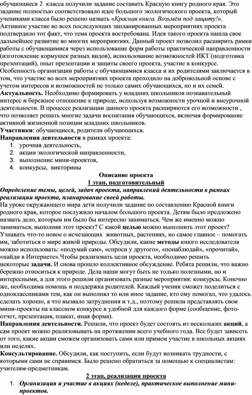 На уроке окружающего мира дети получили задание по составлению Красной книги родного края, которое послужило началом большого проекта. Детям было предложено назвать дело, которым им было бы интересно заниматься. Чем же именно можно заниматься, выполняя этот проект? С какой целью можно выполнить этот проект? Узнавать что-то новое о исчезающих животных, растениях, но самое главное – помогать им, заботиться о мире живой природы. Обсудили, какие методы юного исследователя можно использовать: «подумай сам», «спроси у другого», «понаблюдай», «прочитай», «найди в Интернете».Чтобы реализовать цели проекта, необходимо решить некоторые задачи. И снова прошло коллективное обсуждение. Ребята решили, что важно бережно относиться к природе. Дела наши могут быть не только полезными, но и интересными, а для этого решили организовать разные мероприятия: конкурсы. Конечно же, необходима помощь и поддержка родителей. Каждый ученик сможет поделиться с одноклассниками тем, как он выполнял то или иное задание, кто ему помогал, что удалось сделать хорошо, а что вызвало затруднения и т.д., поэтому решили представлять свои мини-проекты на классном конкурсе в удобной для каждого форме (сообщение, фото- отчет, презентация, плакат, иная форма).
