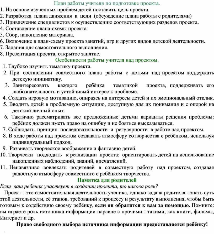 Проект - это самостоятельная деятельность ученика, однако задача родителя - знать суть этой деятельности, её этапов, требований к процессу и результату выполнения, чтобы быть готовым к содействию своему ребёнку, если он обратится к вам за помощью. Помните: вы играете роль источника информации наравне с прочими - такими, как книги, фильмы, Интернет и др.