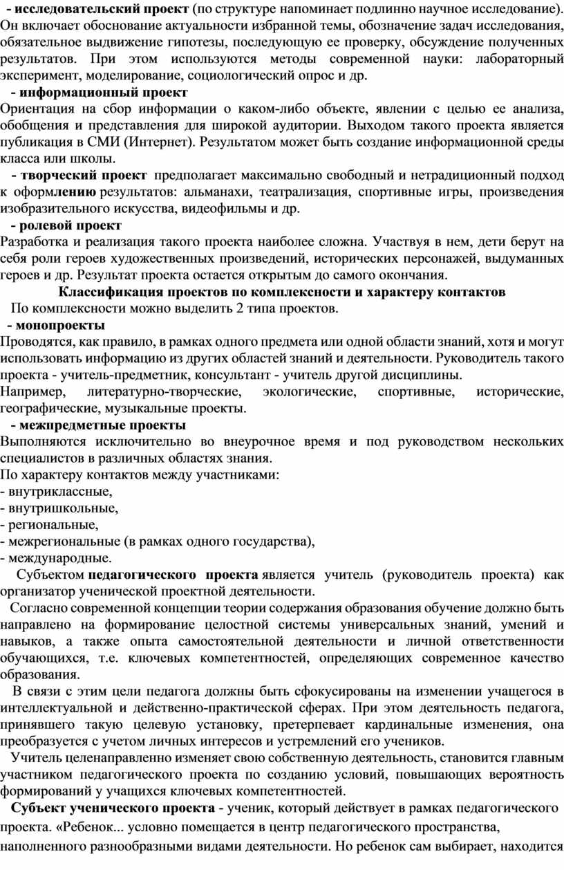 Наиболее лаконичным, на наш взгляд, является определение проекта как «целенаправленного, фиксированного по времени, управляемого педагогом и выполняемое учеником изменение учебной, приближенной к жизненной ситуации с целью формирования у школьники ключевых компетентностей»