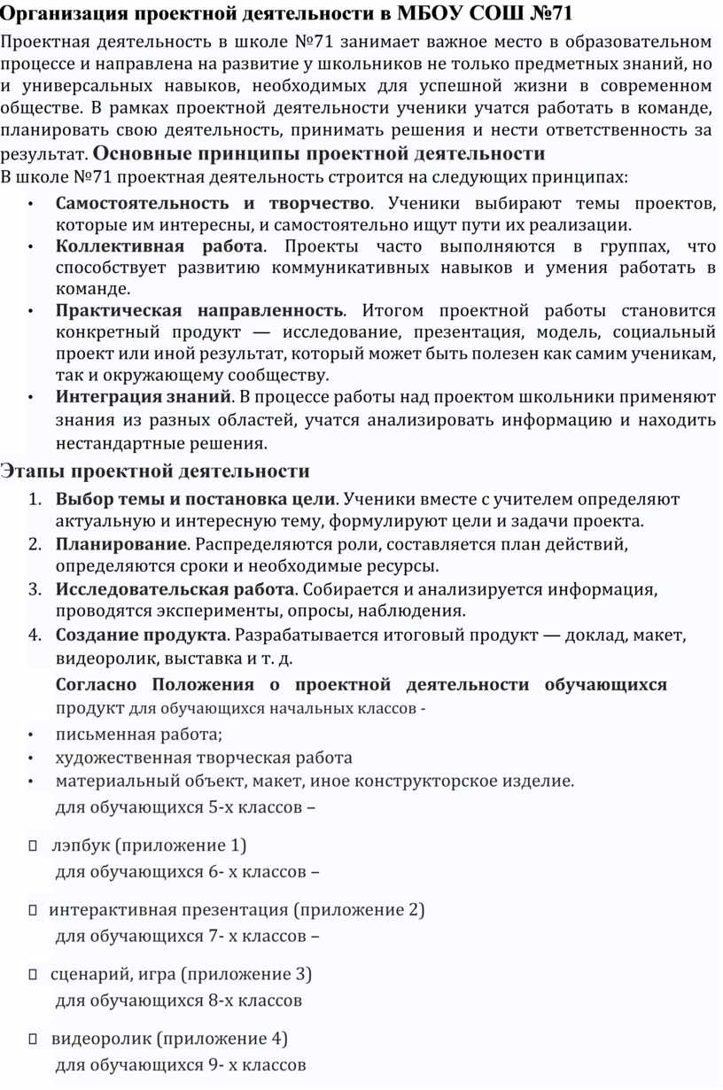 Таким образом, проектная деятельность в школе №71 — это не только современный образовательный инструмент, но и важная часть воспитания ответственных, инициативных и творческих личностей. |