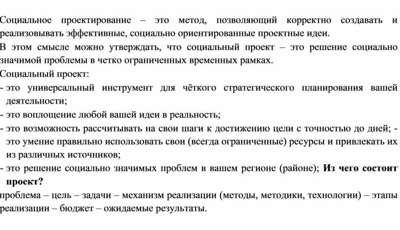 Социальное проектирование – это метод, позволяющий корректно создавать и реализовывать эффективные, социально ориентированные проектные идеи.