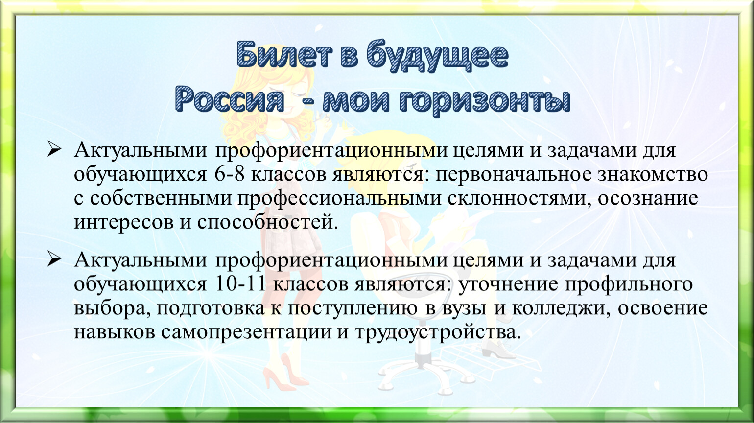 Актуальными профориентационными целями и задачами для обучающихся 10-11 классов являются: уточнение профильного выбора, подготовка к поступлению в вузы и колледжи, освоение навыков самопрезентации и трудоустройства.