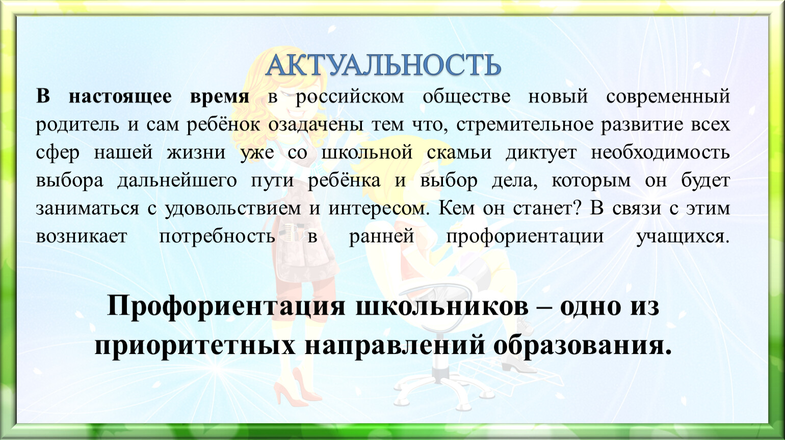 В настоящее время в российском обществе новый современный родитель и сам ребёнок озадачены тем что, стремительное развитие всех сфер нашей жизни уже со школьной скамьи диктует необходимость выбора дальнейшего пути ребёнка и выбор дела, которым он будет заниматься с удовольствием и интересом. Кем он станет? В связи с этим возникает потребность в ранней профориентации учащихся.
