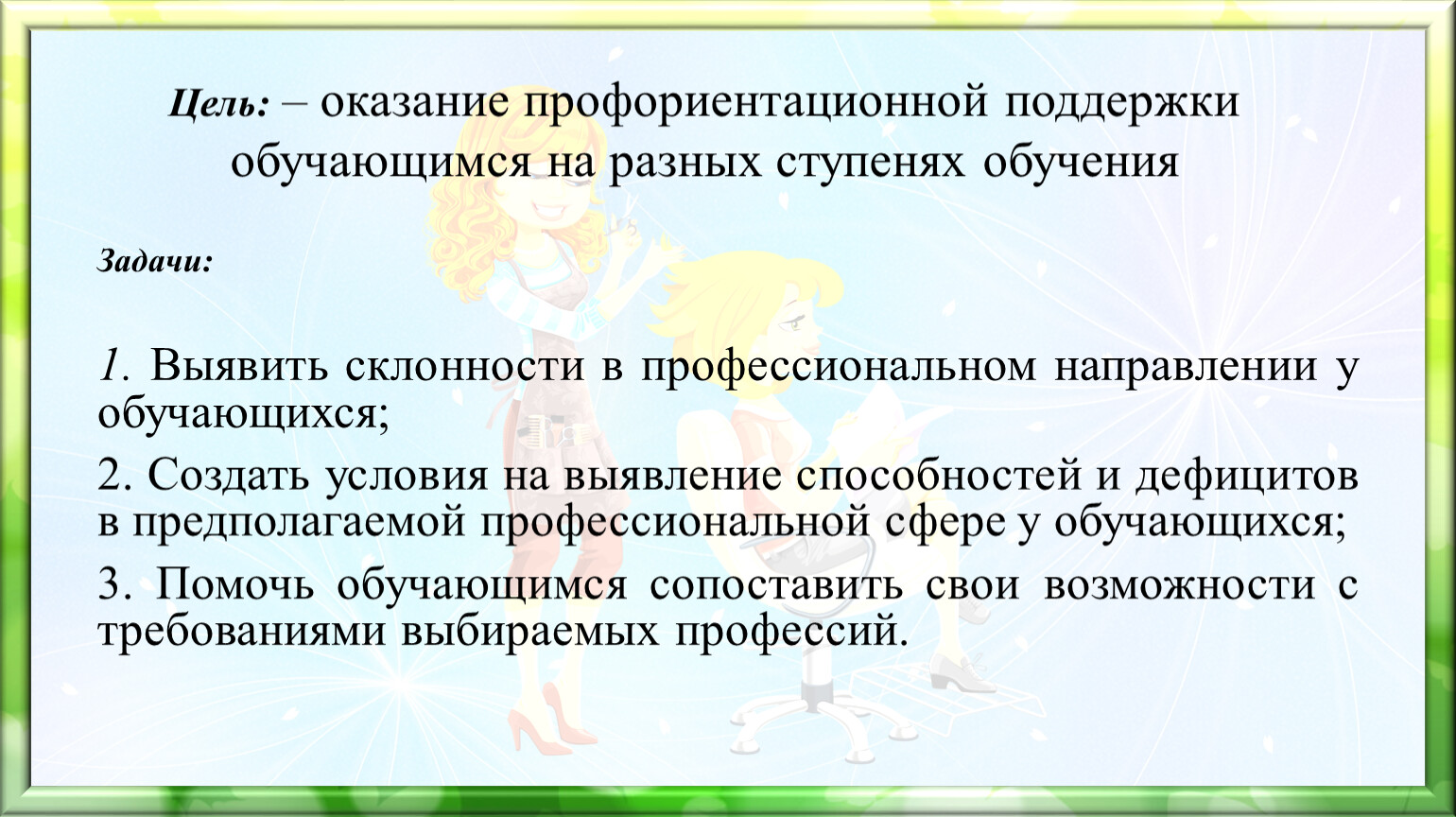 Цель: – оказание профориентационной поддержки обучающимся на разных ступенях обучения