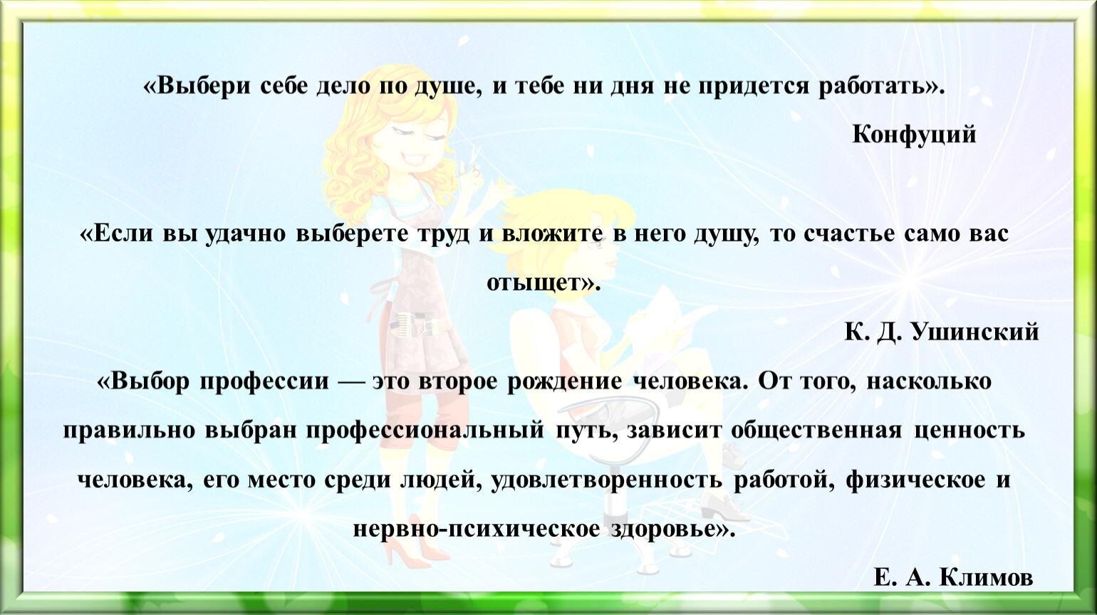 «Выбери себе дело по душе, и тебе ни дня не придется работать». Конфуций «Если вы удачно выберете труд и вложите в него душу, то счастье само вас отыщет». К. Д. Ушинский«Выбор профессии — это второе рождение человека. От того, насколько правильно выбран профессиональный путь, зависит общественная ценность человека, его место среди людей, удовлетворенность работой, физическое и нервно-психическое здоровье». Е. А. Климов