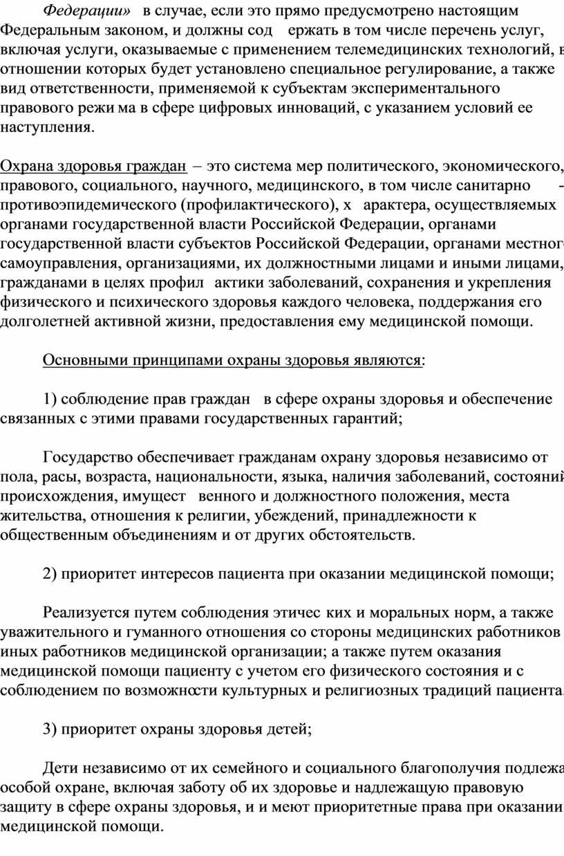 В соответствии с Федеральным законом от 31 июля 2020 года № 258-ФЗ «Об экспериментальных правовых режимах в сфере цифровых инноваций в Российской Федерации» в области законодательства в сфере охраны здоровья может быть установлено специальное регулирование, отличающееся от регулирования, предусмотренного положениями ФЗ «Об основах охраны здоровья граждан в Российской Федерации».