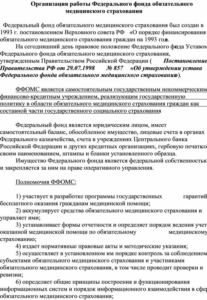 На сегодняшний день правовое положение Федерального фонда Уставом Федерального фонда обязательного медицинского страхования, утвержденным Правительством Российской Федерации (Постановление Правительства РФ от 29.07.1998 № 857 «Об утверждении устава Федерального фонда обязательного медицинского страхования»).