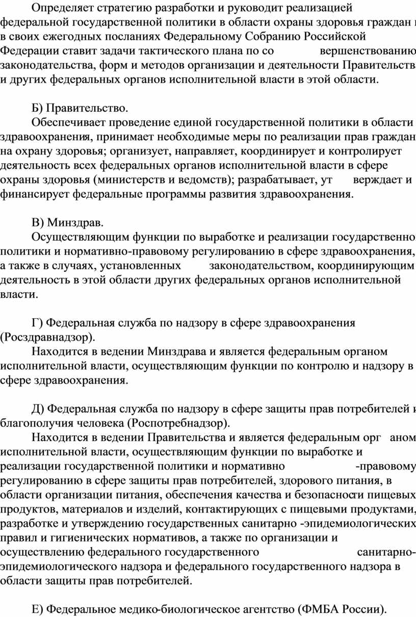 Определяет стратегию разработки и руководит реализацией федеральной государственной политики в области охраны здоровья граждан и в своих ежегодных посланиях Федеральному Собранию Российской Федерации ставит задачи тактического плана по совершенствованию законодательства, форм и методов организации и деятельности Правительства и других федеральных органов исполнительной власти в этой области.